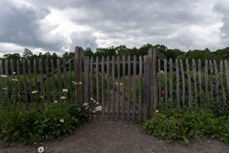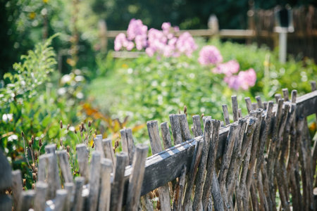 Traditional wooden fence in Poland on blooming garden