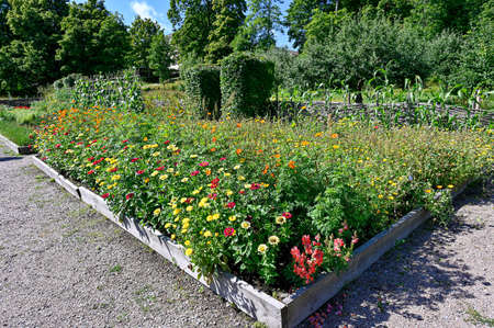 Beautiful landscaped garden with blooming flowers in summertime.