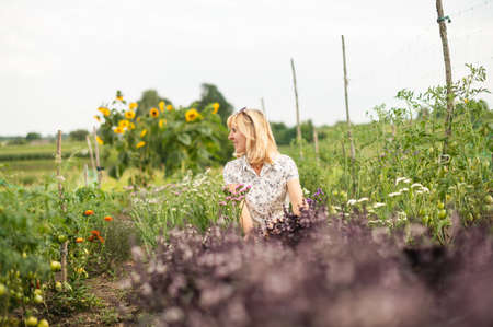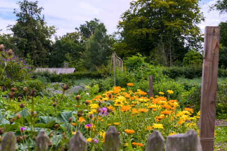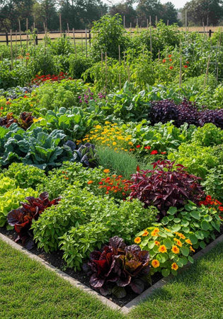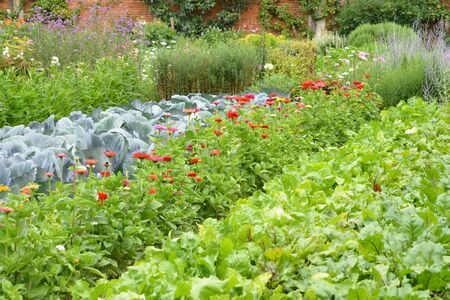 blooming flowers and vegetables in a farmers garden
