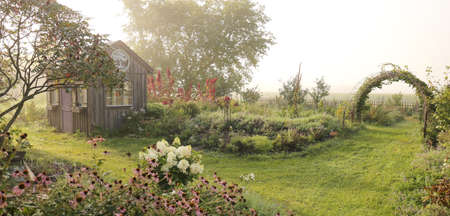 A cozy, little rustic wood she-shed is surround by plants and flowers, and a path leading to a vine covered arched trellis in a cottage garden on a foggy morning.