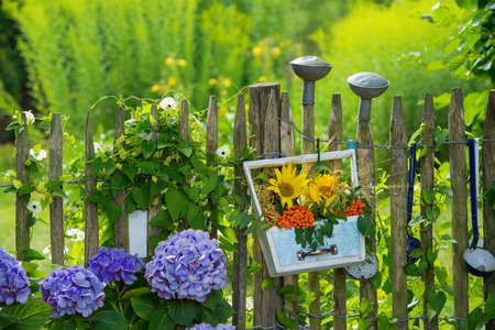 Beautiful flower garden with white hydrangeas and wooden fence