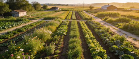 Panoramic view of a vegetable garden in the sunset light.