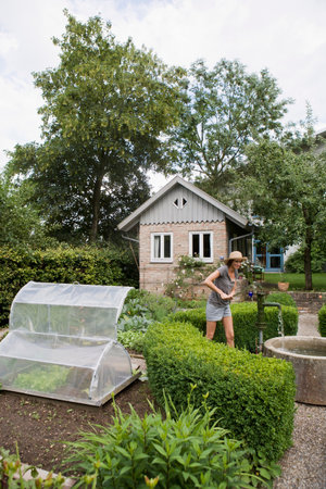 Woman gardener in straw hat walking around her summer garden admiring roses flowers. Checking plants