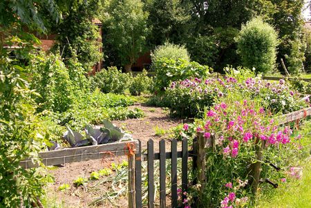 An allotment garden with flowers and vegetables