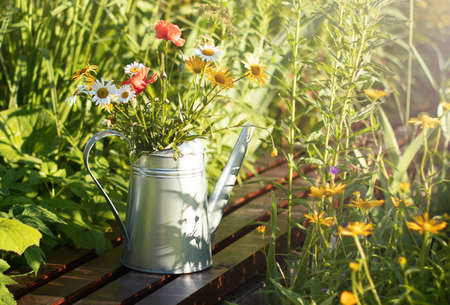 A bouquet of red poppies and daisies in a metal watering can. Summer floral background.