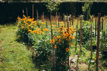 A fenced organic garden with bamboo supports, showcasing a variety of vegetables and flowers.