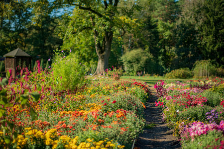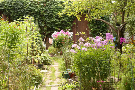Beautiful summer garden with colorful flowers and a path in the foreground