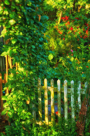Beautiful flower garden with small wooden gate and house in the background