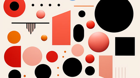 A red, white and black abstract art with circles in different sizes, AI