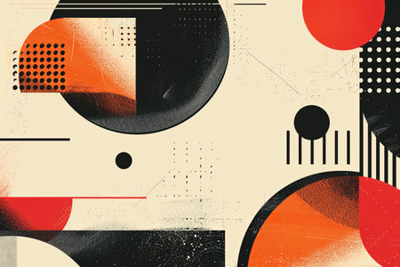 Vibrant abstract geometric design showcasing a balanced arrangement of colorful circles and rectangles with dynamic lines, against a textured backdrop.