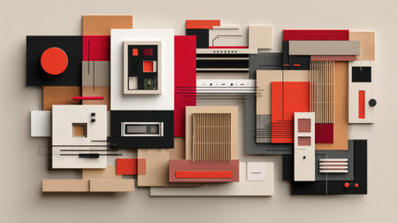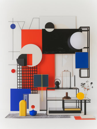 A dynamic moodboard showcases Bauhaus design principles, featuring a striking arrangement of geometric shapes, vibrant colors, and unique objects that inspire creativity and innovation.