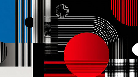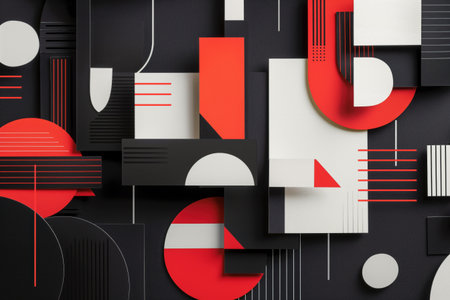 Modern abstract background featuring a composition of geometric shapes in red, black, and white, creating a dynamic and visually appealing design