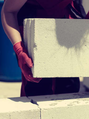 Unrecognizable woman working on construction site, building house, installing gray airbricks. Industrial work concept.