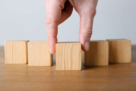 Laying out by hand a pyramid wooden cubes leading up.Concept growth and development