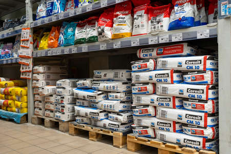 MINSK, BELARUS - May 16, 2020: Building materials are sold in a hardware store. Bags of cement, plaster and other goods for construction and repair are stacked on pallets.