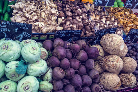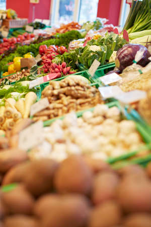 Full of fresh vegetable stalls in an organic supermarket
