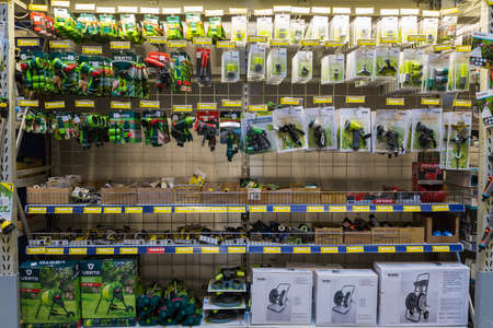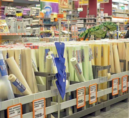 Large selection of building materials are sold in a hardware store. Goods for construction and repair. Minsk, Belarus, 2022