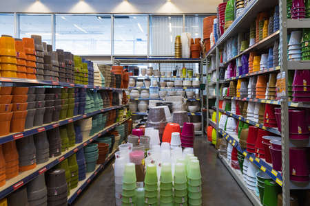 February 24, 2021 Balti Moldova. Huge supermarket, garden department. Pots for seedlings and indoor flowers