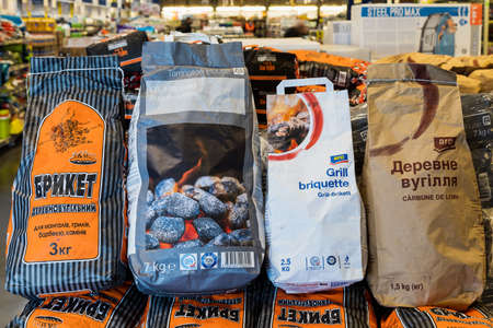 May 12, 2021 Beltsy Moldova supermarket showcase in the picnic department. Charcoal for barbecue. Illustrative editorial