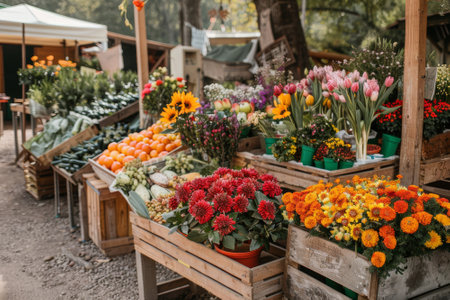 Crisp morning at a farmers market showcasing stands with organic produce and handmade floral arrangements. AI generated.