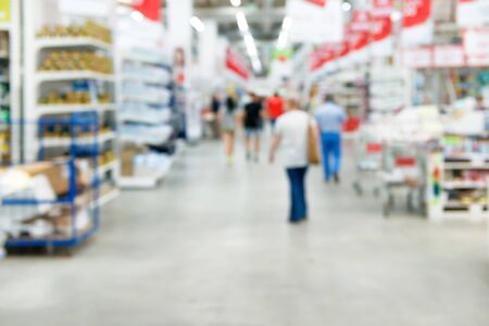 Abstract blurry aisle inside hardware supply and construction store.
