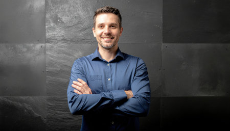 A handsome young man with curly hair smiles thoughtfully in a stylish office.