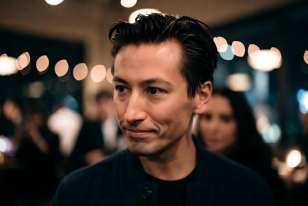 Portrait of a handsome Asian man with dark hair in a dark blue sweater.