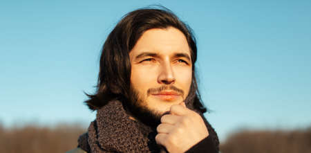 Outdoor portrait of handsome young man, on the background of blue sky.