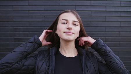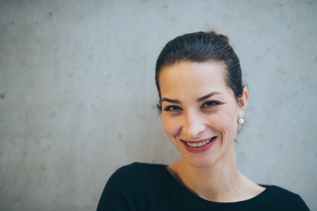 glowing happiness concept - portrait of a radiant 20s girl with a natural smile looking at camera for serenity,studio shot on gray copyspace banner