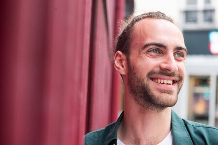 portrait of a joyful young man smiling funny, concept of happiness and teenager lifestyle, copy space for text