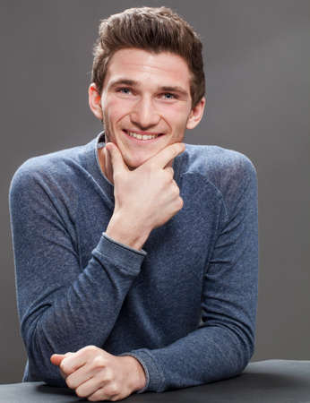 handsome smile - portrait of a joyful young male student sitting, holding his chin looking friendly, grey background studio