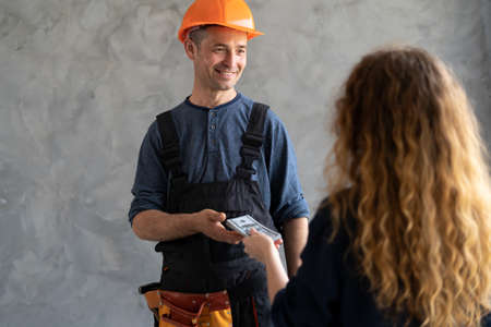 Woman client pays man construction worker repairman in helmet money dollars in hands back view. The customer transfers the money to the construction foreman.