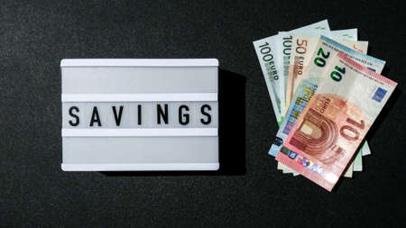 Lightbox board with word SAVINGS in black letters around Euro banknotes. Money, Business, finance, investment, saving. Cash bill. Business budget of wealth and prosperity finance