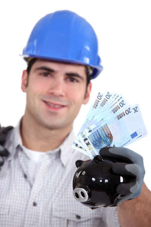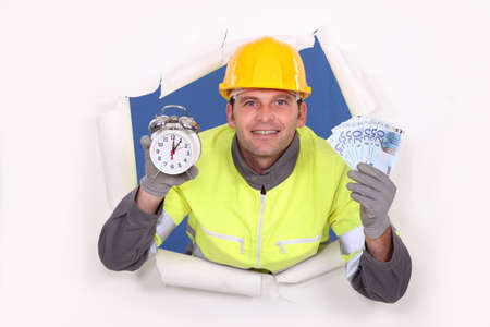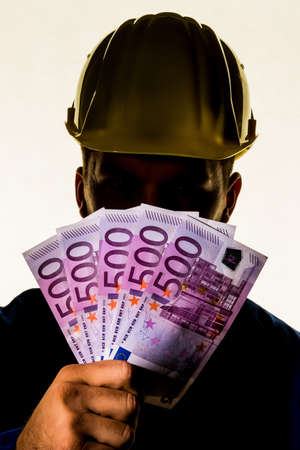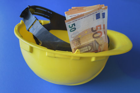 worker with yellow helmet showing euro banknotes in the foreground on yellow background