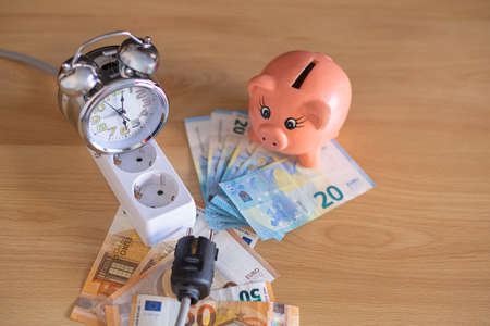 piggy bank with euro banknotes on the table and electricity sockets and an analog clock with light saving concept