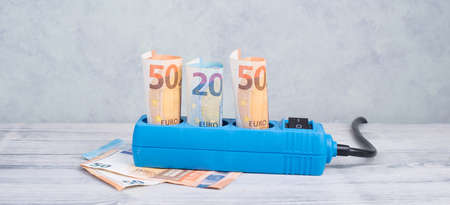 Euro banknotes in a power outlet, rising prices, expensive green electricity, Germany