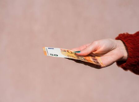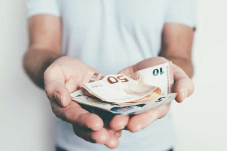 Hand holding showing euro money and giving or receiving money like tips, salary. 50 EURO banknotes EUR currency isolated. Concept of rich business people, saving or spending money.