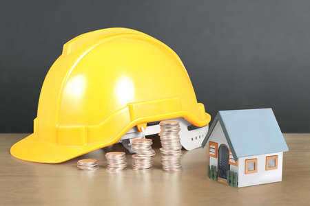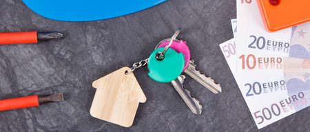 Keys with house shape, currencies euro and work tools for engineering work. Building or buying home concept. Technology