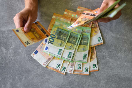 Woman hands with euro money on grey background. Man counting money, economy concept, money distribution