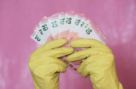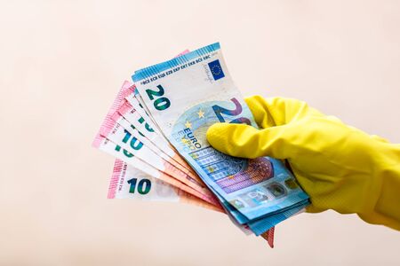 World money concept, hand with gloves receiving, giving or holding EURO banknote, isolated on blurred background. Corona virus COVID-19 outbreak. Concept of prevention virus spread