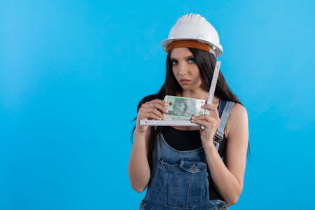A woman in a hard hat holds a bundle of banknotes in her hand and encourages cooperation.