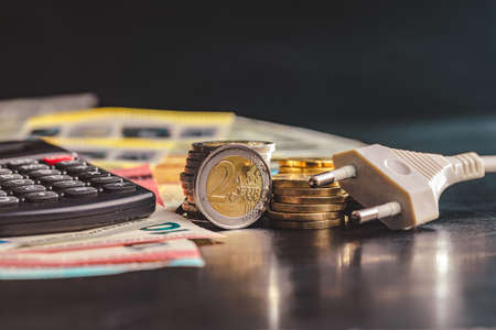 Woman hand puts electric power plugs in open wallet with Euro banknotes. Energy efficiency, power consumption, rising electricity price and expensive energy concept
