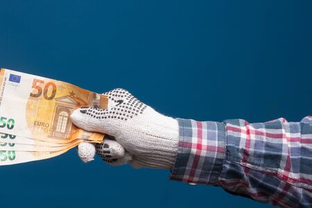 hand holding a 50 euro bill on a blue colored background. Money, finance, wealth, business concept.