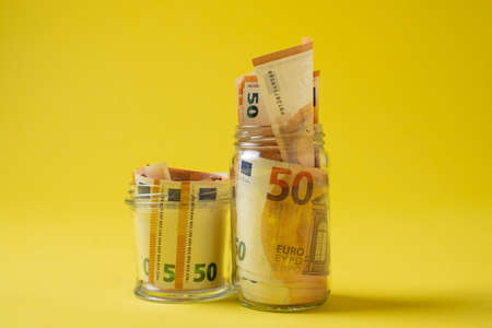 3 glass jars with Euro notes, 2€ coins and loose cash for housekeeping and savings