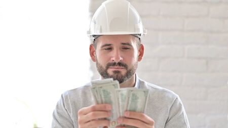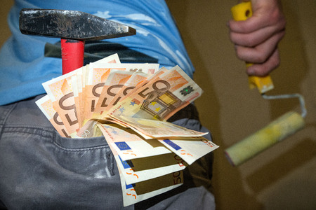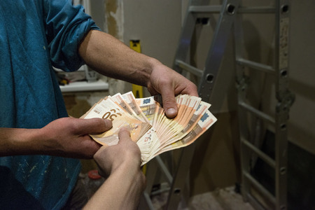 Construction worker receives the payment or salary. Expensive renovation at home or apartment. Concept of illegal money, shadow economy. Counting euro bills
