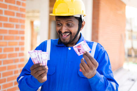 excited happy plumber after seeing or counting Money - concept of repairman received payment for completing work, professional occupation and earnings.