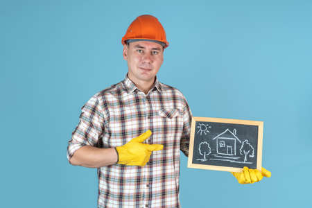 A builder in an orange helmet holds a chalk board with a drawing of a house in his hands and points at it with his finger. The concept of fulfilling the wishes of customers