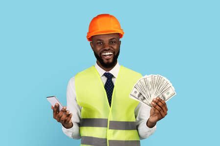 Happy Construction Worker With Money Cash And Smartphone Posing Over Blue Background