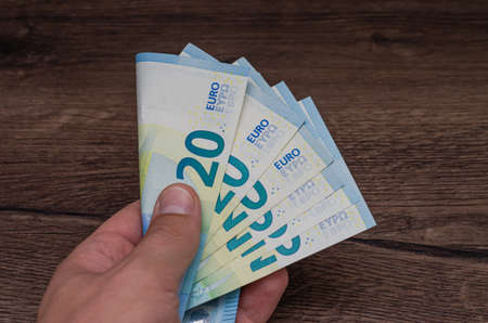 Selective focus on detail of EURO banknotes. Counting or giving EURO banknotes. World money concept, inflation and economy concept