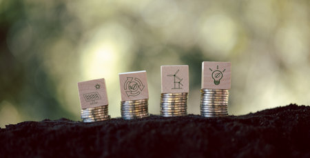 Green energy icons on wooden cubes with stack money coin. Green business growth. Finance sustainable development. growing money, finance and investment. Alternative sources of energy. Eco business